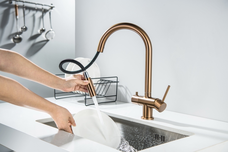 Trójdrożna bateria kuchenna Blue Water CYRUS Miedź z wyciąganą wylewką