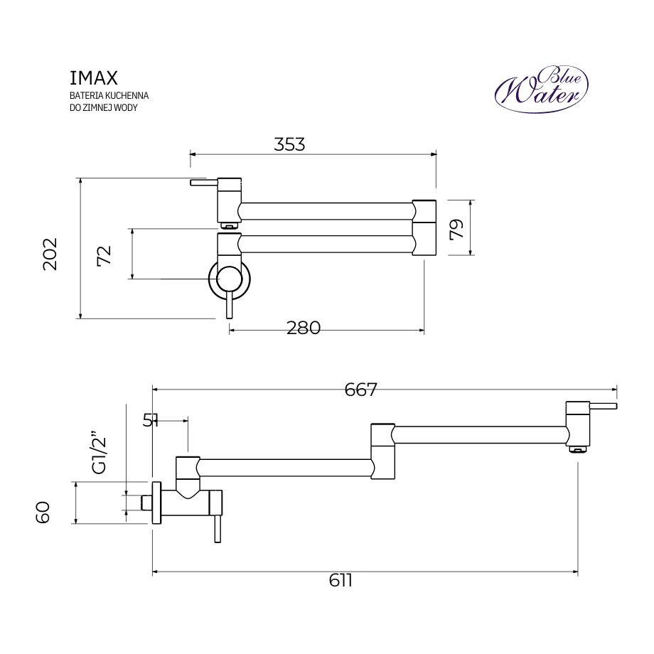 Bateria naścienna Blue Water Imax to nowoczesny, rozkładany kran do napełniania garnków, który znacząco ułatwia proces gotowania. Wykończenie w kolorze antycznego mosiądzu, nadaje kuchni ciepły charakter, doskonale komponując się z różnymi stylami wnętrz. Możliwość integracji baterii Imax z filtrem wody (takim jak odwrócona osmoza) stanowi olbrzymi atut.