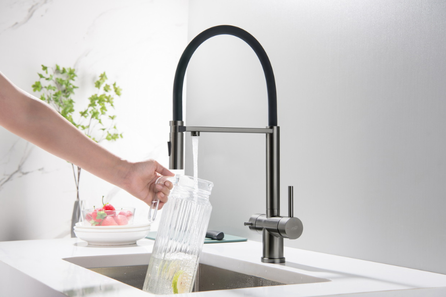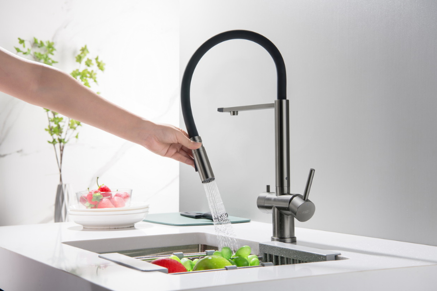 Model Tusar stanowi doskonały przykład połączenia innowacyjnych rozwiązań, wygody użytkowania i ponadczasowego designu. Ta trójdrożna bateria kuchenna z wyciąganą wylewką umożliwia podłączenie do systemu filtracji wody. Dzięki temu korzystasz z wody ciepłej i zimnej z sieci, jak i czystej wody filtrowanej z jednego kranu! Dwuobwodowe połączenie zapewnia pełną separację wody z sieci i wody z filtra.