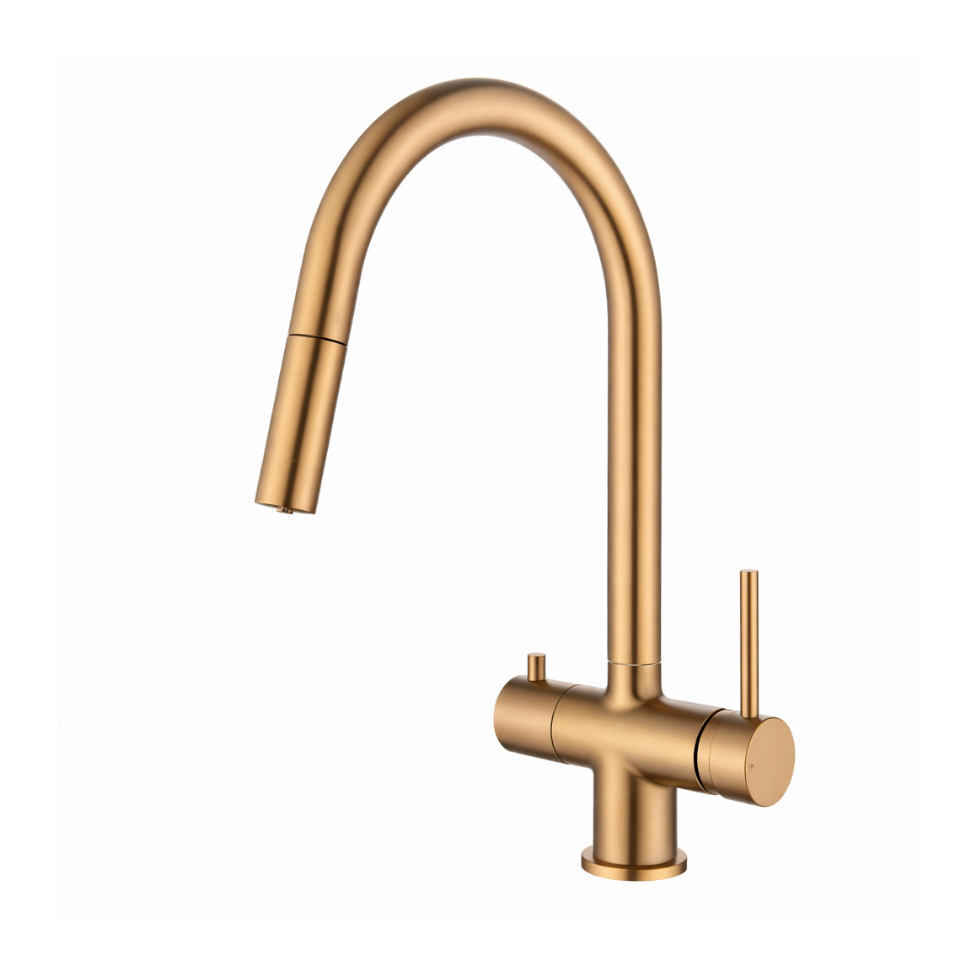CYRUS w kolorze miedzi to w pełni funkcjonalna bateria czterodrożna z wyciąganą wylewką, ceramicznymi głowicami i kompletnym zestawem przyłączy do systemu filtracji wody.