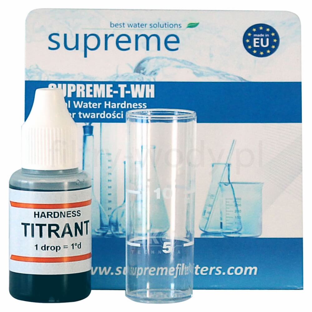 Tester twardości wody Supreme to prosty kropelkowy miernik stopnia twardości wody. Pomiaru twardości wody dokonuje się bezproblemowo i szybko. Wynik otrzymywany podczas badaniem testerem twardości wyraża się jako twardość wody w stopniach niemieckich, na podstawie zmiany zabarwienia. Zawartość odczynnika wystarcza na około 50 pomiarów. Dokładna ilość zależna jest od twardości wody. Im jest ona większa, tym większe zużycie titranta i szybsze zużycie testera do badania wody. Liczba dodanych kropel odczynnika jest równoważna liczbowo wartości twardości wody.