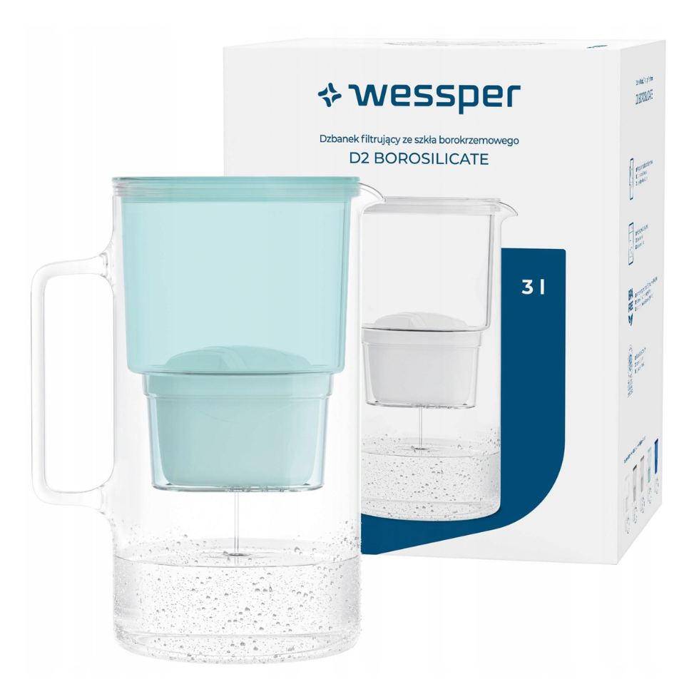 Szklany dzbanek filtrujący WESSPER D2 BOROSILICATE 3L MIĘTOWY z filtrem Aquamax