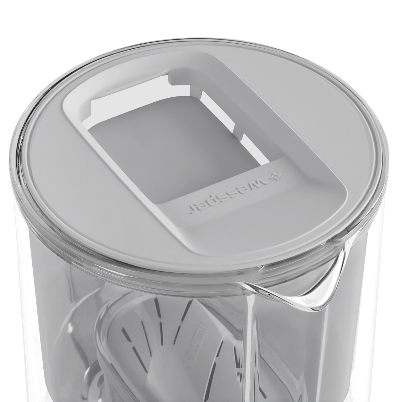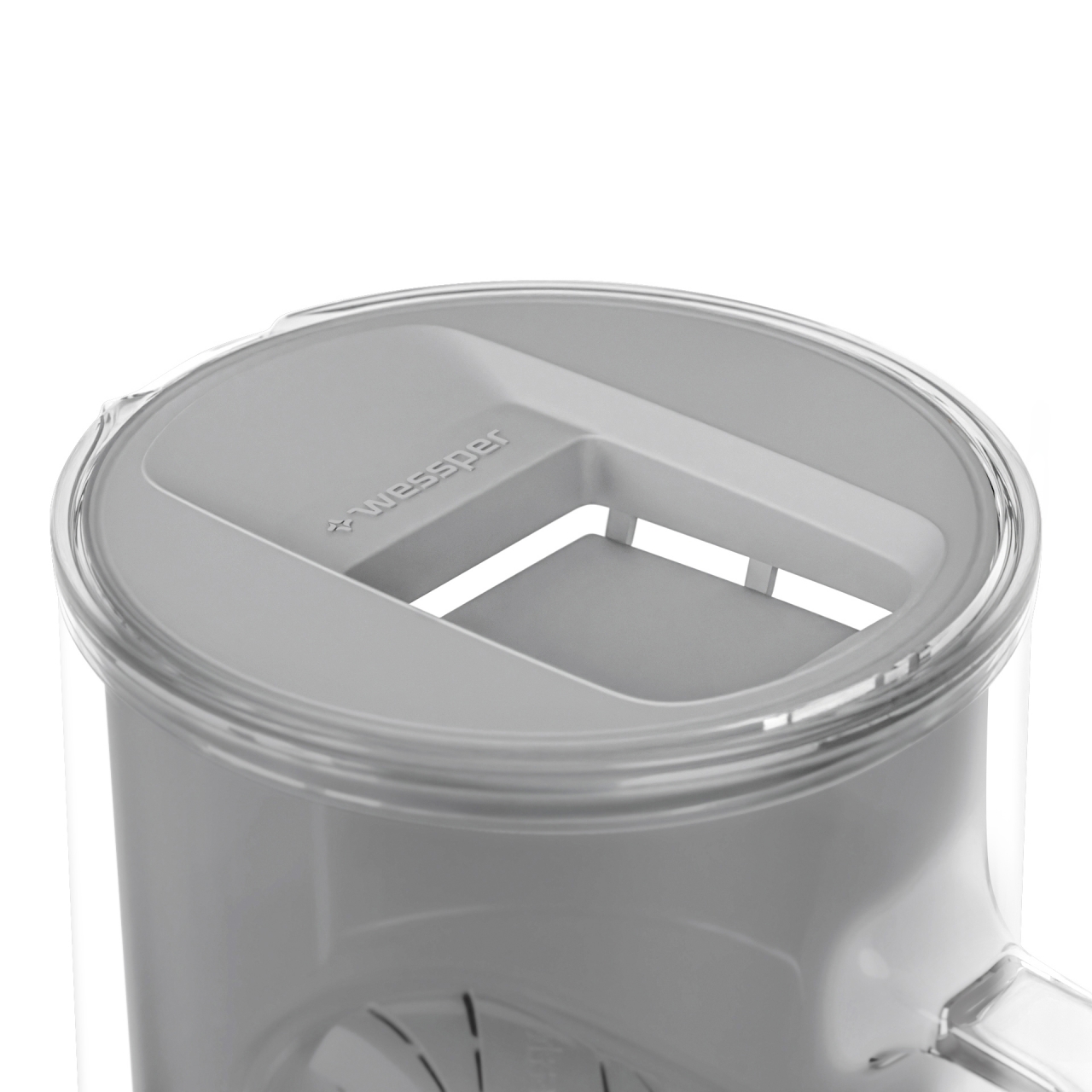 Odcień grey na pokrywie to najbardziej uniwersalna wersja kolorystyczna dzbanka Wessper D2 BOROSILICATE. Nie dominuje na blacie z konglomeratu, nie ginie na ciemnym drewnie, nie kontrastuje agresywnie z białą zabudową. Szary wariant współgra z matową armaturą kuchenną i stalowymi urządzeniami AGD, od ekspresu po toster. Przejrzysty szklany korpus eksponuje krystalicznie czystą wodę, wzmacniając wizualne wrażenie świeżości.