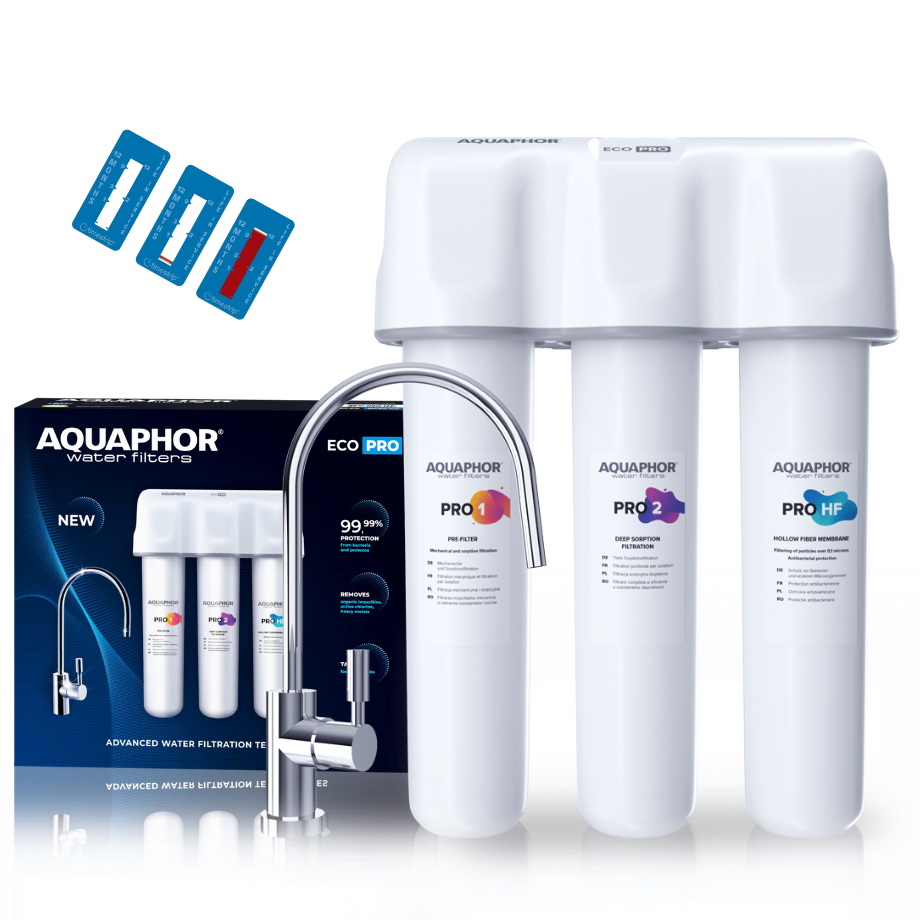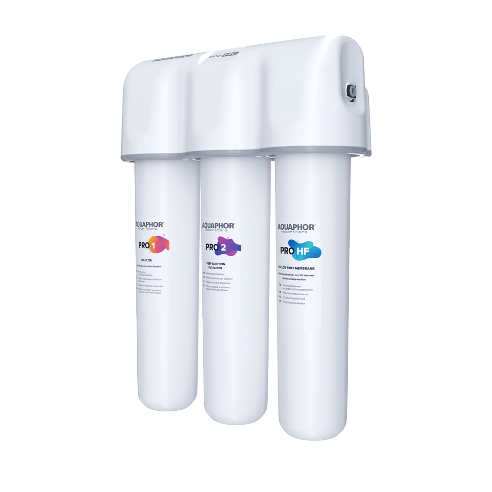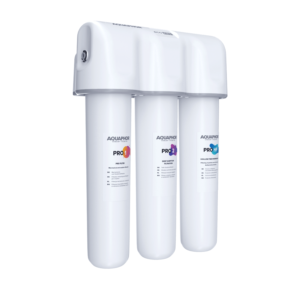 Aquaphor ECO Pro oznacza praktycznie nieograniczony dostęp do krystalicznej i świeżej wody pitnej. Przefiltrowana woda płynąca z kranu jest gotowa od razu do spożycia. Jednak aby woda stała się zdatna do bezpośredniego picia, oczyszcza ją zestaw 3 wymiennych wkładów filtrujących. Każdy z wkładów usuwa odpowiada za usuwanie innych zanieczyszczeń. System Aquaphor ECO Pro korzysta z następujących wkładów filtrujących: