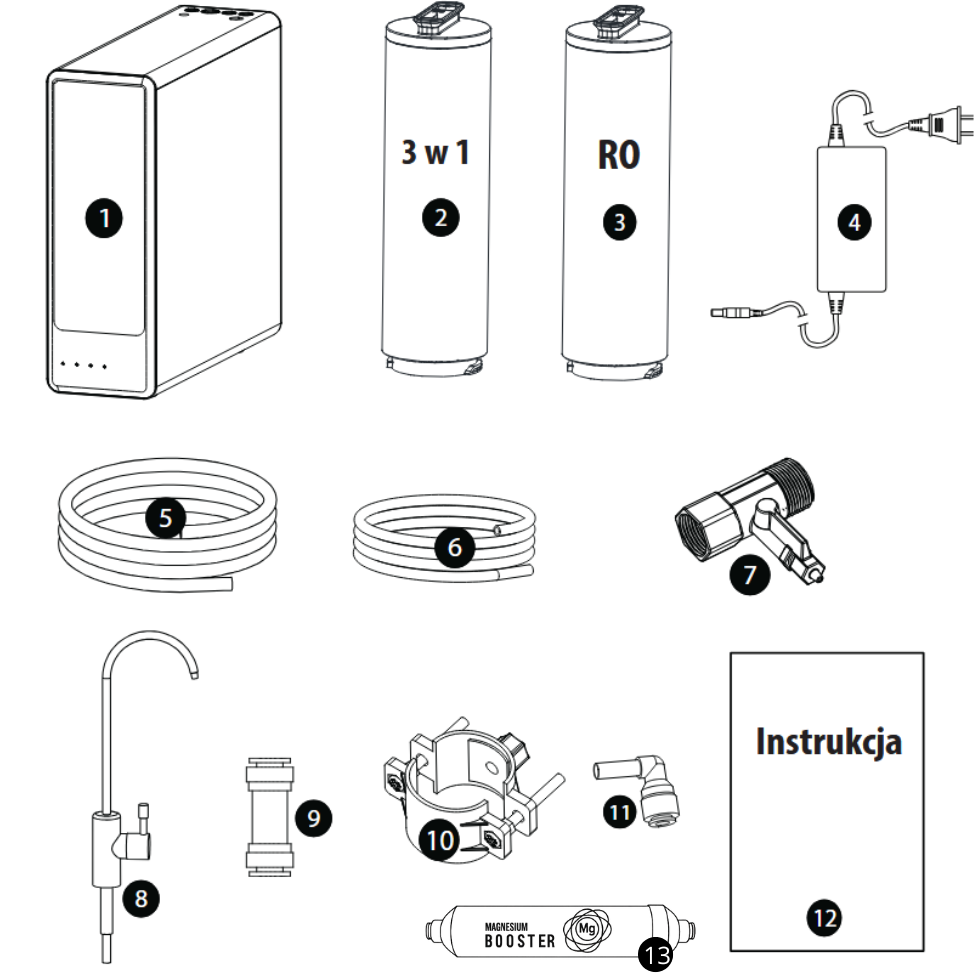 RO-UX6-600G zawiera wszystkie niezbędne przyłącza oraz elegancką wylewkę montowaną w blacie kuchennym. System po instalacji jest gotowy do użycia i nie wymaga dodatkowych akcesoriów.