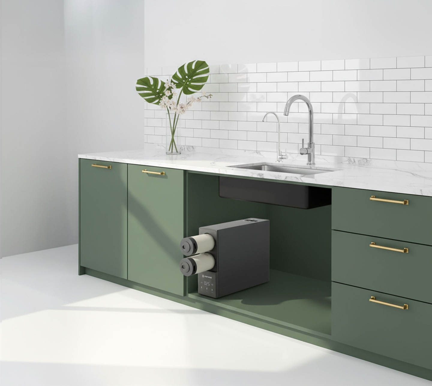 Klarwod RO DIGITAL 600G to system filtracji wody pitnej, który ma działać w ciasnej przestrzeni kuchennej bez utraty wydajności. W modelu DIGITAL zrezygnowano z klasycznego zbiornika magazynującego. Za każdym razem urządzenie podaje wodę bezpośrednio przefiltrowaną. Taki układ eliminuje stagnację wody i utrzymuje stabilne parametry fizyczno-chemiczne przy każdym poborze.