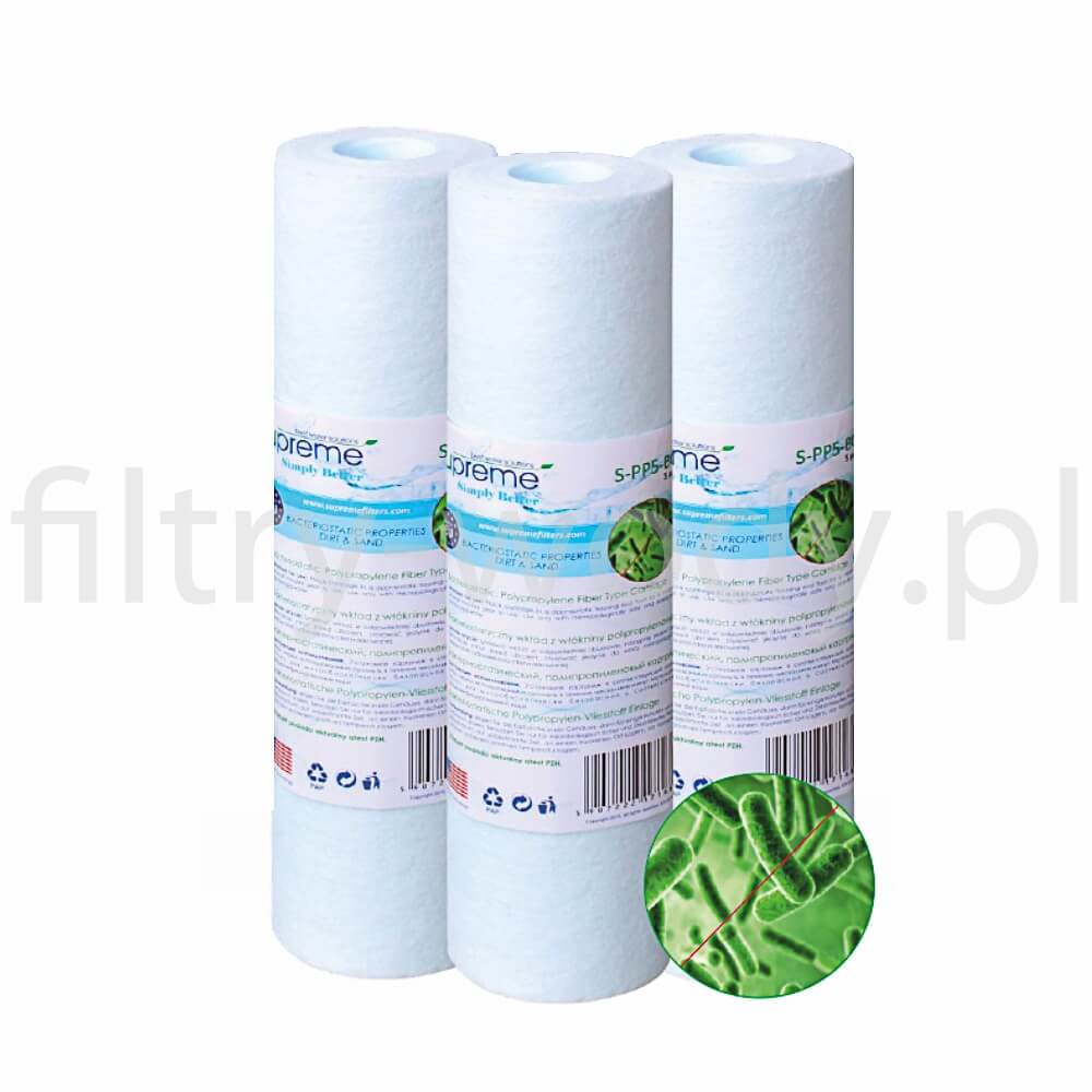 Wkłady bakteriostatyczne wykonane są z włókniny polipropylenowej. Wzbogacone są w czynnik bakteriostatyczny, dzięki któremu zapewniona jest ochrona przed rozwojem mikroorganizmów bakteryjnych. Innowacyjna technologia BACINIX oparta na nanosrebrze sprawia, że wkłady Supreme są najbezpieczniejsze na rynku, ponieważ nie zawierają szkodliwych metali ciężkich. Ich żywotność jest uzależniona od jakości wody, średnio wynosi 3-6 miesięcy. Do ich zalet należą również: